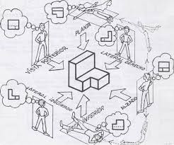Los objetos, piezas, máquinas, edificios, planes urbanos, entre otros , se suelen representar en planta (vista superior, vista de techo, planta de piso, cubierta, entre otros ), alzado (vista frontal o anterior y lateral; al menos una) y secciones (o cortes ideales) indicando claramente sus dimensiones mediante acotaciones; son necesarias un mínimo de dos proyecciones (vistas del objeto) para aportar información útil del objeto.